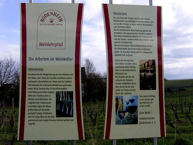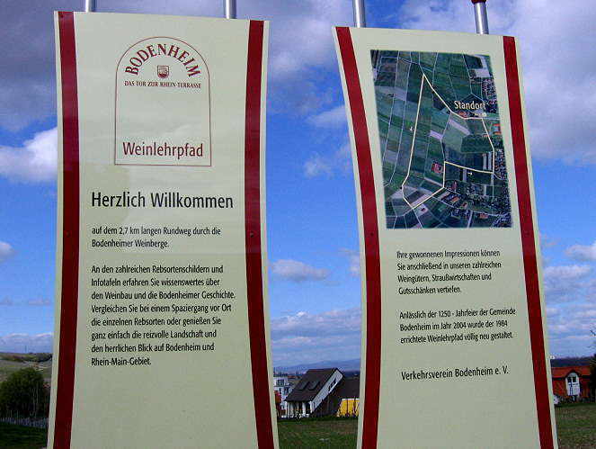 Der Bodenheimer Weinlehrpfad wurde 2004 zur 1250-Jahr-Feier neu erstellt. Großformatige Tafeln zu Wein-Themen und Rebsorten begleiten den Wanderer rund um die Lage Westrum. Wem die knapp drei Kilometer lange Strecke zu kurz ist, der kann weiter hinaufgehen bis zur Höhe und von dort den freien Blick genießen, der bei klarer Sicht bis Frankfurt, Odenwald und Taunus reicht.