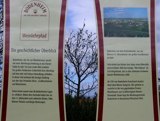 Zwischen Mainz und Nackenheim liegt Bodenheim, das selbst ernannte „Tor zur Rhein-Terrasse“. Es ist einer der ersten Orte in denen Weinbau urkundlich bezeugt ist: Im Jahr 754 erhielt das Fuldaer Kloster von einem gewissen Rantulf einen Weinberg in „villa batenheim“ geschenkt. Vom 11. Jahrhundert an sicherten sich nicht weniger als 36 Mainzer Klöster, Stifte und Adelsgeschlechter Weinhöfe in Bodenheim. Sie geben dem Ort bis heute sein Profil.